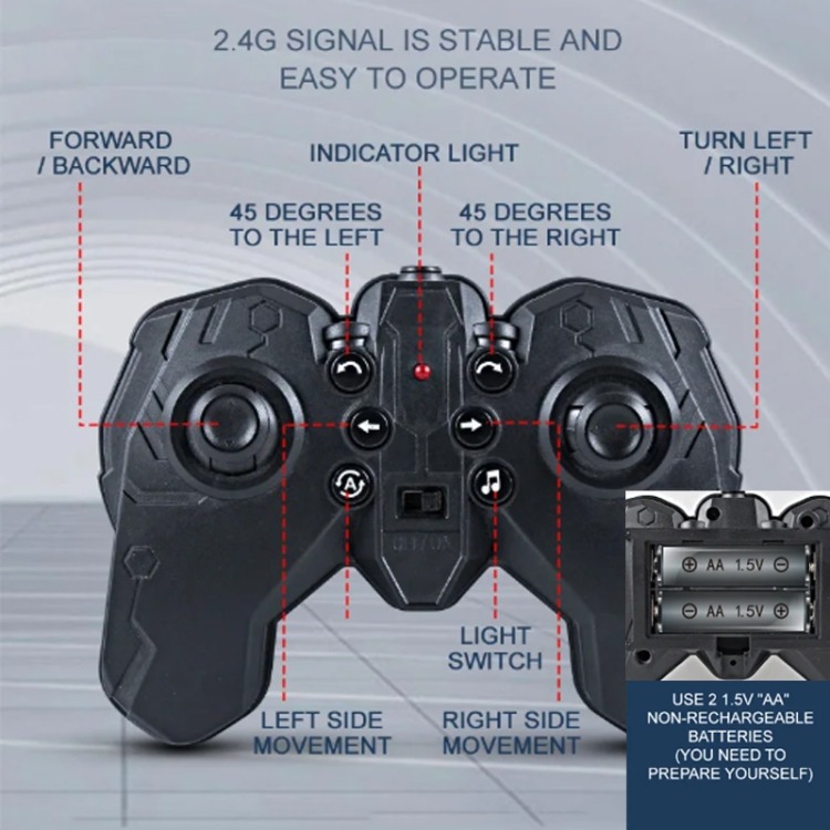 4. Remote control power supply: 2 x AA batteries (handle), 2 x AAA batteries (watch) – ( batteries are not included in the shipment)