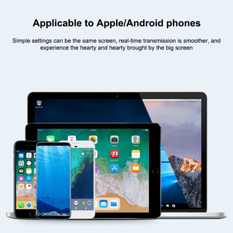 – Compatible with Android 4.2, Mac OS X 10.9, iOS 7.0, Windows 8.1. Play games or share photos and videos with your family on big screen, without having to huddle around the tiny screen of a mobile device. Also, support multiple formats of photos, videos and files, out of the shackles of cable, the meeting has become intelligent and efficient