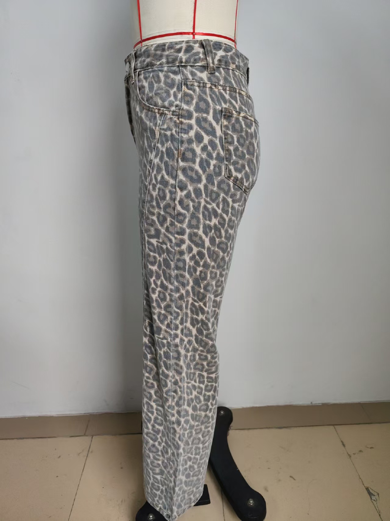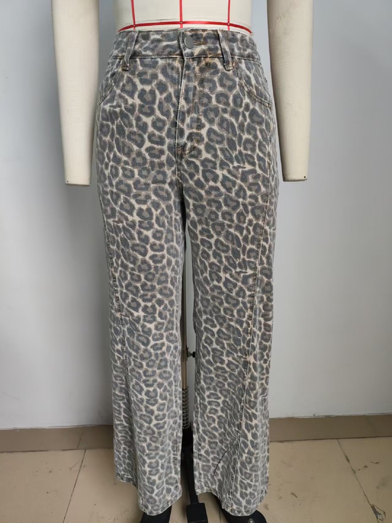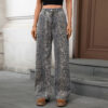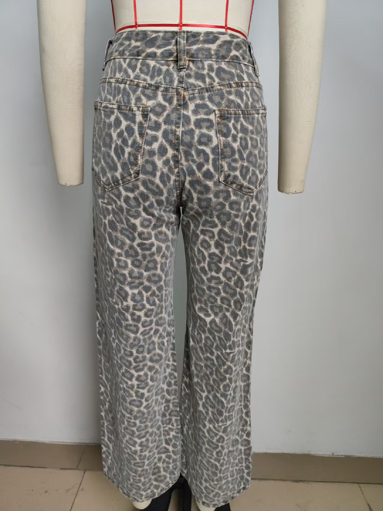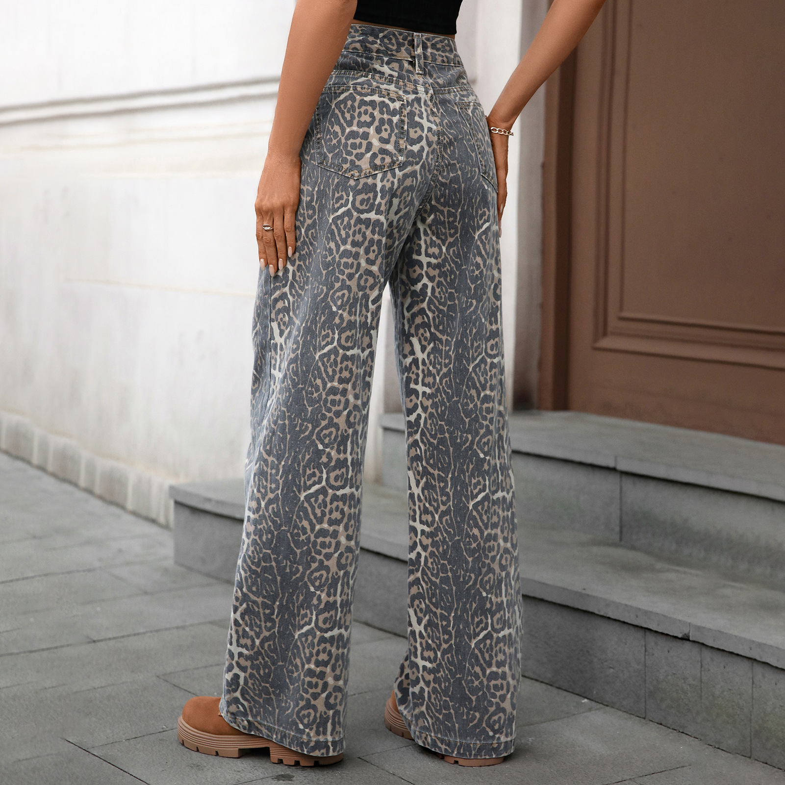 Retro High Street Loose Casual Leopard Print Jeans Wide Leg Straight Long Jeans