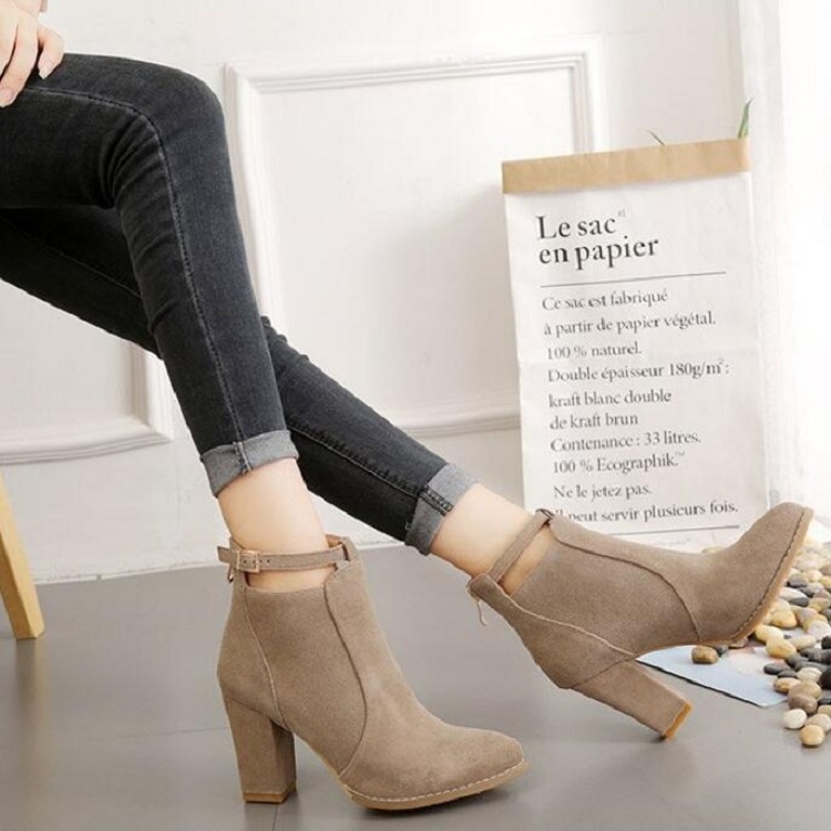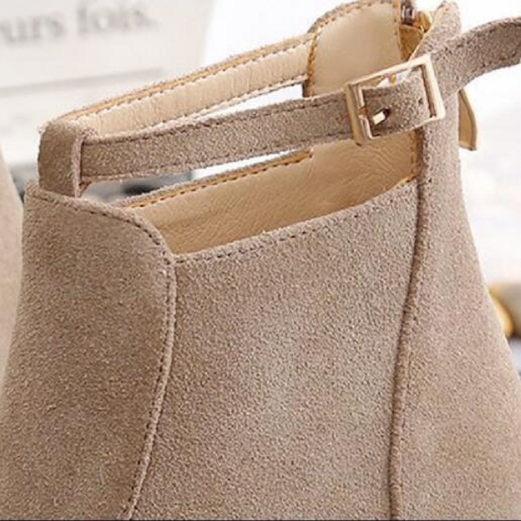 5. Design: round head, thick heel, belt buckle, middle tube, side zipper